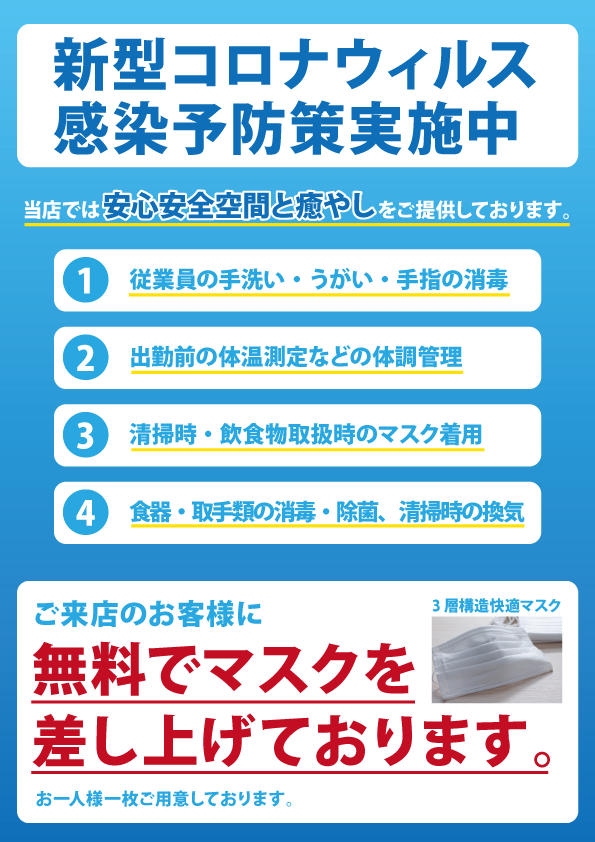 20.04.24 新型コロナウイルス感染症予防につきまして いつも当ホテルをご利用いただきまして、ありがとうございます。 ホテルヌーンでは、お客様にご安心してご利用いただけますよう、 以下のとおり感染予防策を実施しております。 また、ご来店のお客様に無料でマスクを差し上げております。